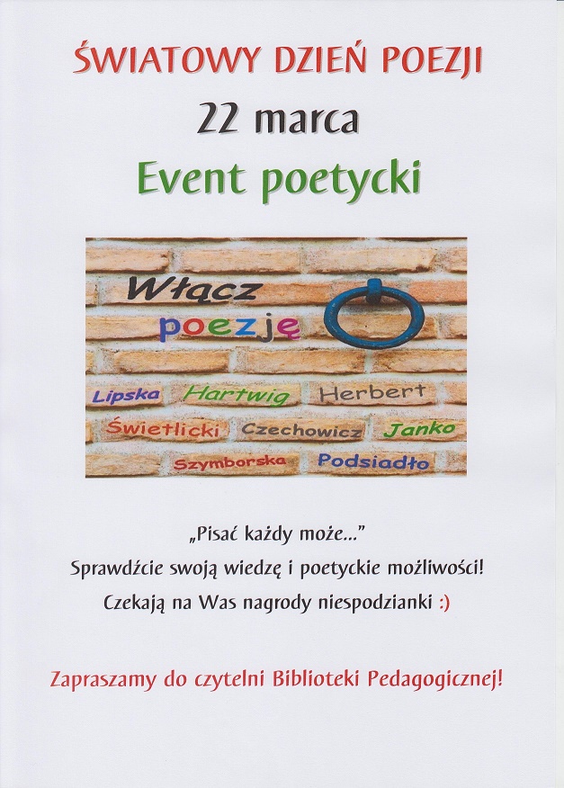 Parafrazując słowa piosenki, że "pisać każdy może, trochę lepiej lub trochę gorzej", w dniu 22 marca organizatorzy zapraszają wszystkich chętnych, chcących sprawdzić swoje umiejętności i możliwości poetyckie do czytelni Biblioteki Pedagogicznej. Na uczestników, oprócz dobrej zabawy, czekają niespodzianki.